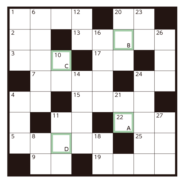 クロスワードを解いて、色枠に入った文字をAからDの順に並べると、何という言葉になるでしょう?