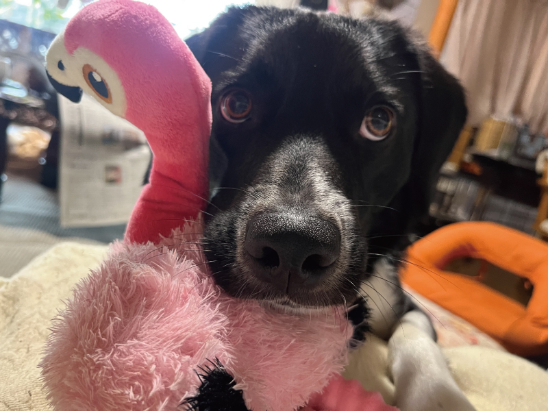 お気に入りのフラミンゴのぬいぐるみで引っ張り合いこするのが大好きです!(H・A様)