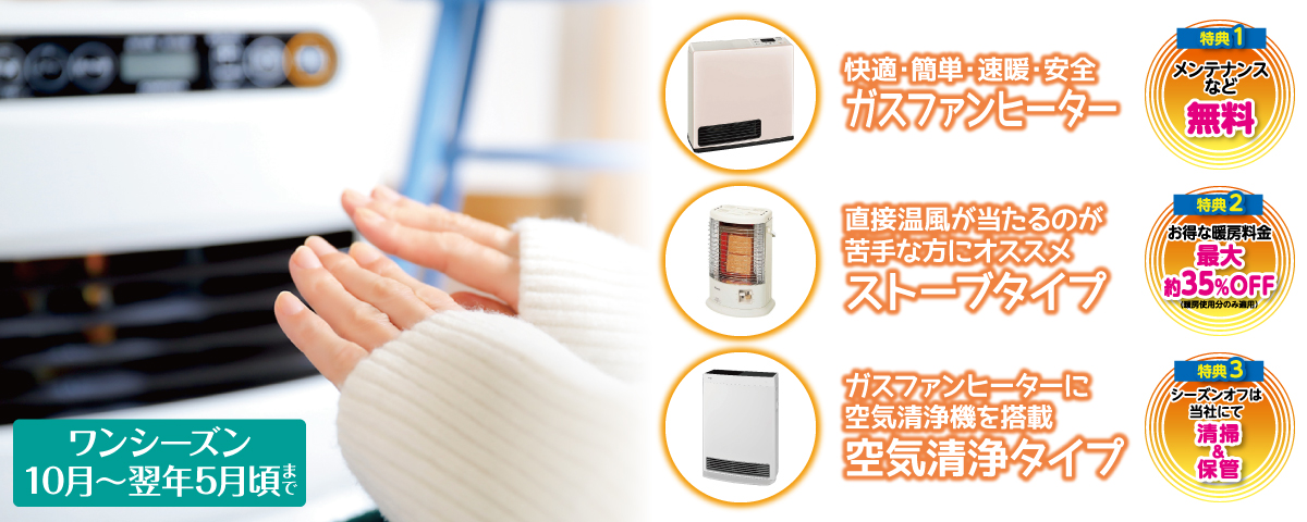 ガス栓が必要ですが燃料タンクがないので本体が軽く、移動や収納も楽であり、ニオイも気になりにくいのが特長です。